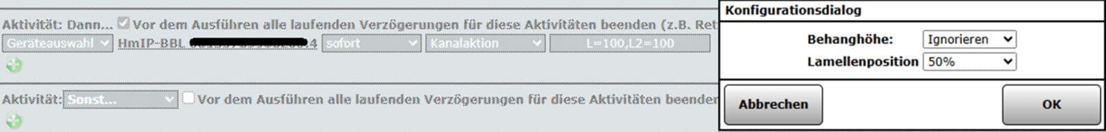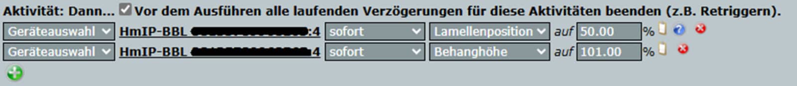 Es ist immer notwendig, neben der Lamellenposition auch einen Befehl für die Behanghöhe zu setzen. Soll Letztere nicht verändert werden, wählen Sie den Wert „101 %“. Beachten Sie hierzu auch den folgenden Screenshot: